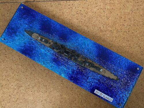 船尾の日の丸はデカールを貼り合わせるように指示があります。 このとうりやってみたら見事に失敗。 悩んだ結果、プラモデルのビニール袋の表裏にデカールを貼ってみましたが、これが大成功! さて、いよいよ展示台となる海面の製作ですが、結局TAMIYAさんの…